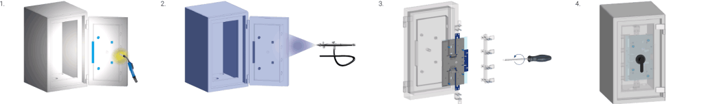 - An der Tresortür werden vier Halterungen sowie ein Widerlager präzise angebracht, um das Riegelwerk sicher zu positionieren und zu stützen.