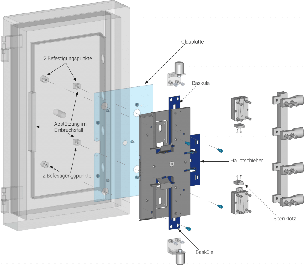 - Nach dem Bruch der Glasplatte muss ein Angreifer nicht nur den oder die Schlossriegel, sondern auch alle Relocker entfernen, um das Riegelwerk zu öffnen. Dies stellt eine erhebliche zusätzliche Hürde dar.